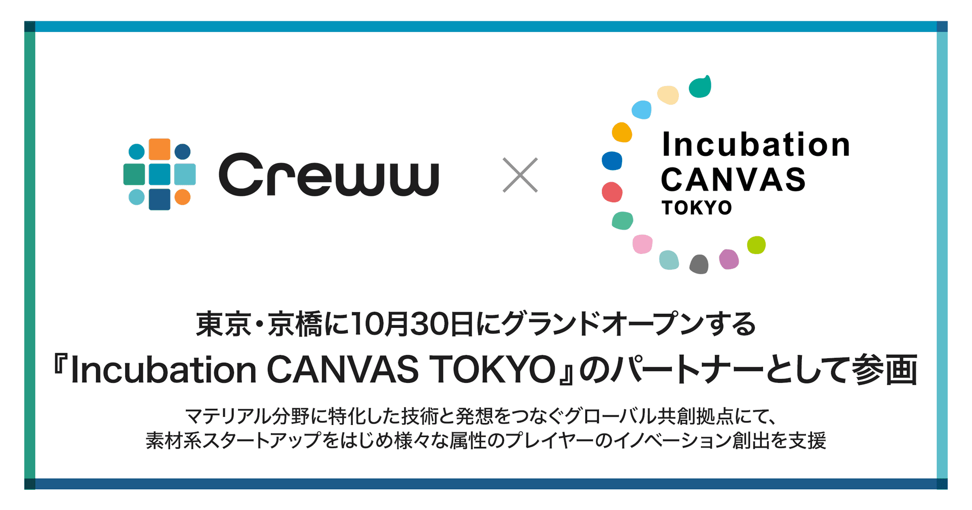 Creww、東京・京橋に10月30日にグランドオープンする『Incubation CANVAS TOKYO』のパートナーとして参画 〜マテリアル分野に特化した技術と発想をつなぐグローバル共創拠点にて、素材系スタートアップをはじめ様々な属性のプレイヤーのイノベーション創出を支援〜