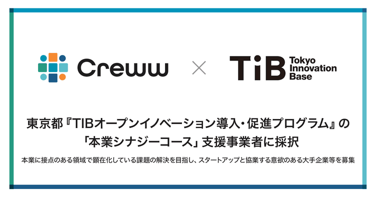 Creww、東京都『TIBオープンイノベーション導入・促進プログラム』の「本業シナジーコース」支援事業者に採択 〜本業に接点のある領域で顕在化している課題の解決を目指し、スタートアップと協業する意欲のある大手企業等を募集〜
