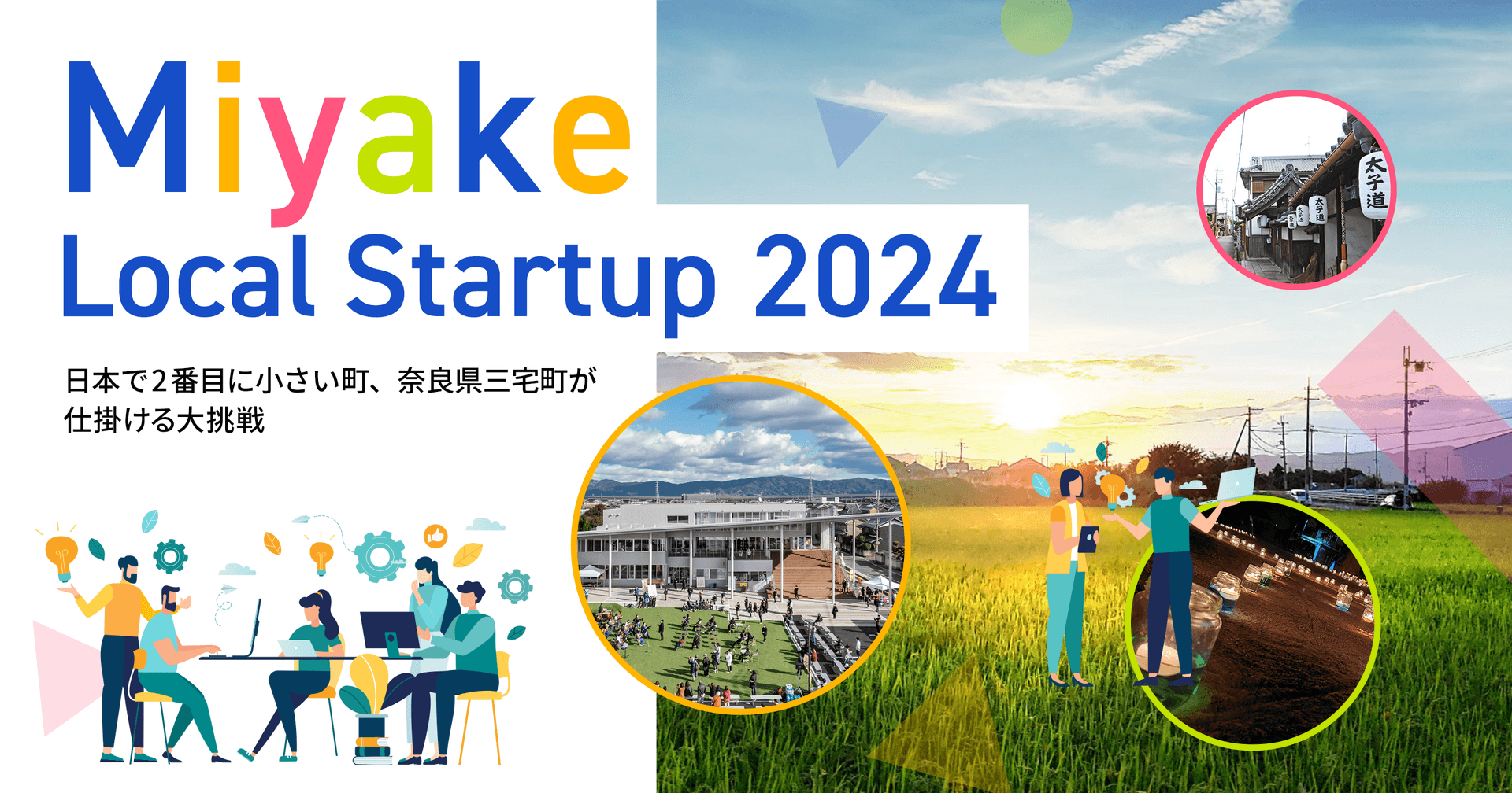 『Miyake Local Startup』は、三宅町が掲げる20年後のビジョン「自分らしくハッピーにスモール(住もうる)タウン」の実現に向けて、自由な発想で地域課題に立ち向かう挑戦者と共に三宅町発の新規ビジネス創出に取り組むプログラムです。本プログラムでは、三宅町の地域課題解決をきっかけに、全国そして世界に飛び出すスタートアップ企業や起業家の成長支援を実施し、「スタートアップするならみやけ」となることの土壌を育むことを目指します。